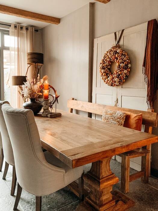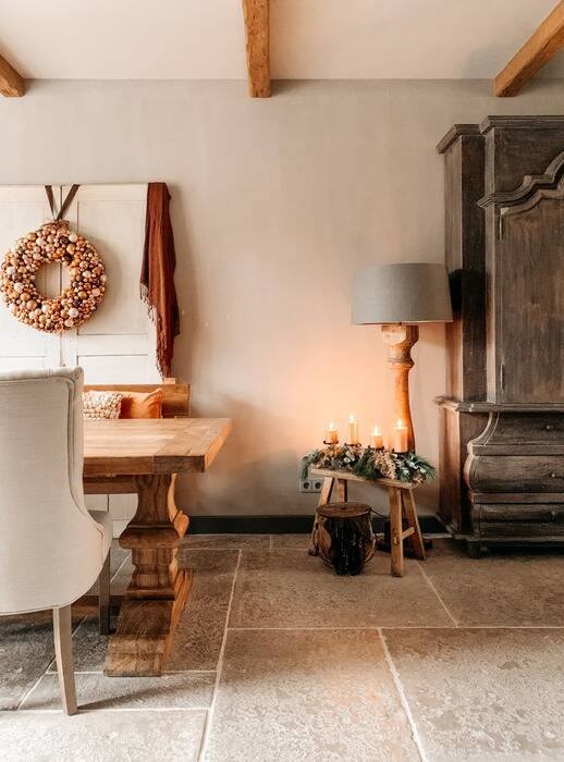De kerstballenkrans die aan oude deuren hangt, werd ook zelf gemaakt door Arianne. Het is eigenlijk vrij simpel volgens haar om zo een krans te maken. Je begint met een strokrans en plakt er dan dan ballen op met een lijmpistool. Eerst de buitenring, dan de binnenring en opvullen maar! Je kan werken met verschillende kleuren en groottes. Het eindresultaat mag er echt zijn, het fleurt meteen je interieur op. Het geeft een extra kerstsfeer en handig ook, want de volgende jaren kan je hem gewoon opnieuw gebruiken. Ook leuk om de ballen die je gebruikt in je krans, opnieuw te gebruiken in je boom of kerststukken. Zo krijg je een harmonieus geheel in je interieur.