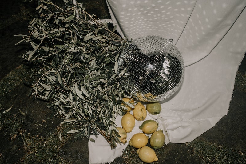 Charline gaf tijdens onze voorbereidingen aan dat discoballen een herkenbaar element zijn in haar bedrijf Club Content. We besloten die signature sparkle helemaal door te trekken in de styling. Van de entree tot de ceremonie en tafeldecoraties — overal gaven de glinsterende bollen een speelse, glamoureuze toets.