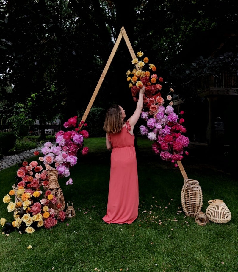Ik dook in mijn bloemenvoorraad en ging voluit met tinten als fuchsia, oranje, warm geel, frambozenrood en koraal. Alles in een losse, speelse styling die trouw bleef aan de typische boho sfeer — maar dan met véél meer pit.
